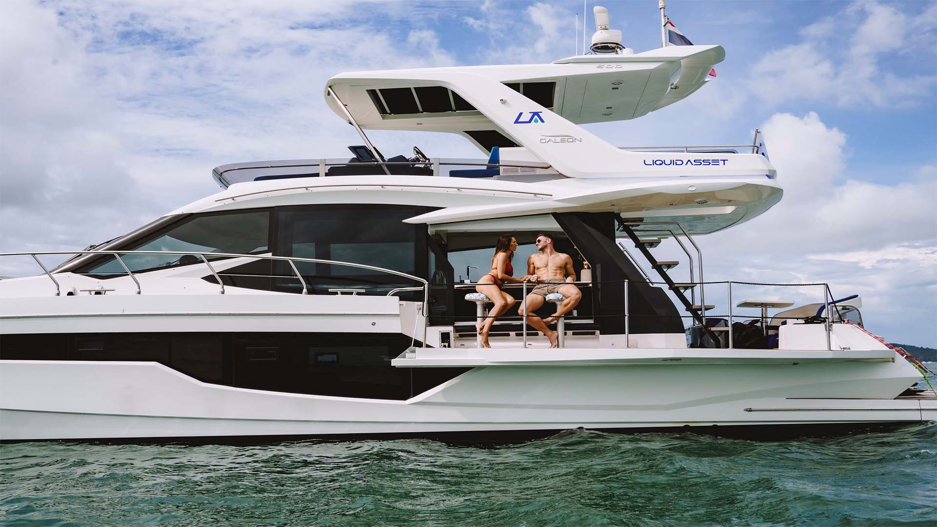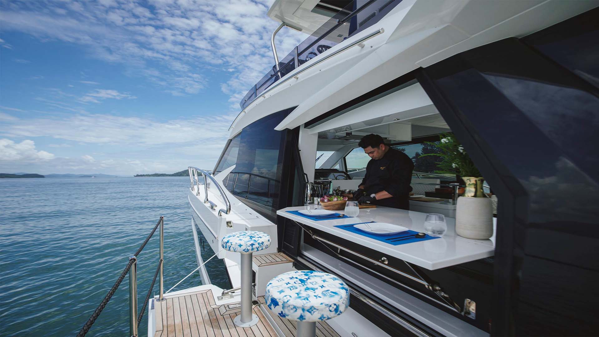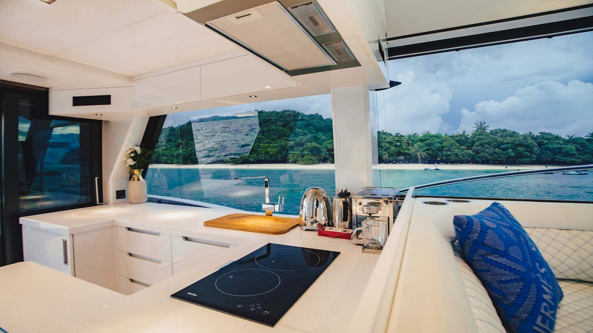 Раздвижные двери соединяют салон с кормовой террасой, создавая единое пространство, которое особенно ценится в тропическом климате. Когда балконы разложены, а двери открыты, получается единая зона площадью около 40 квадратных метров.