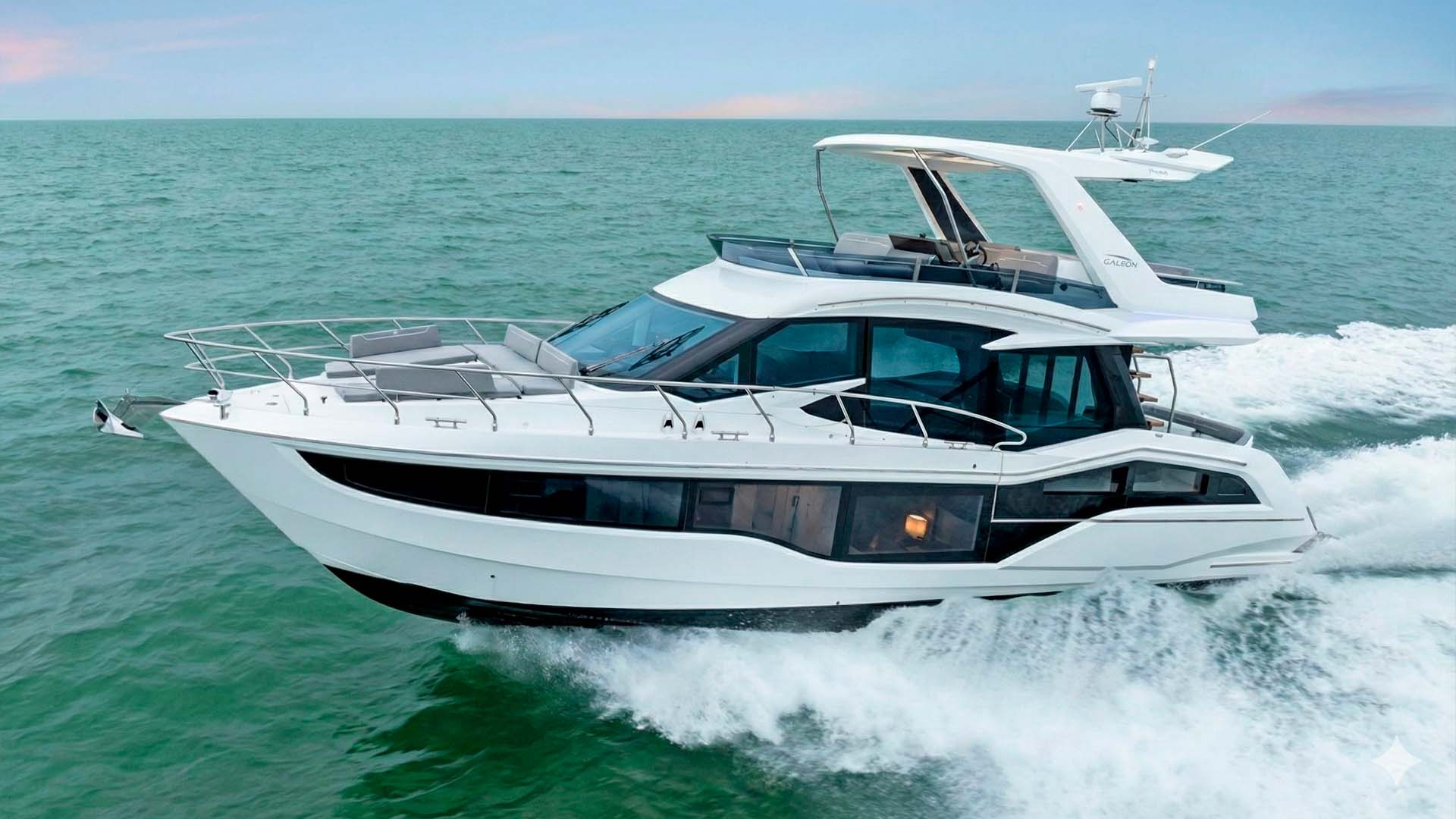 Что бросается в первую очередь при виде этой яхты – откидные балконы, благодаря которым Galeon Yachts получила множество наград. Капитан нажимает кнопку и боковые секции главной палубы, начинают плавно раскладываться наружу. За несколько секунд, две платформы-балкона превращают Galeon 500 из элегантной моторной яхты? в плавающую террасу с панорамными видами на 270 градусов.