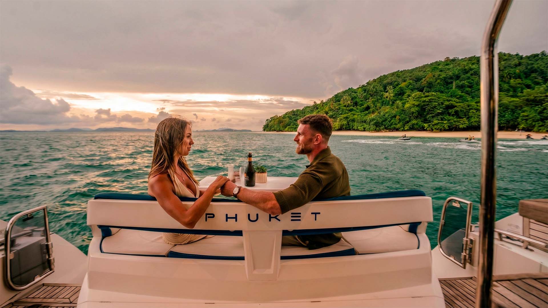 Острова Рача (Racha Yai и опционально Racha Noi) - это маршрут, где Galeon 500 Fly трансформируется в полноценный floating beach club. В знаменитом Patok Bay на Racha Yai, небольшая осадка позволяет встать на якорь, где глубина всего 3-4 метра, а под килем живые коралловые сады. Развернутые балконы оказываются прямо над рифом, можно спуститься в воду с платформ и через минуту уже плавать среди тропических рыб. Прозрачность воды (часто 25-30 метров) позволяет видеть рыб и кораллы прямо с яхты, не заходя в воду. На Racha Noi, если повезет вы сможете наблюдать за мантами, которые часто приплывают к яхтам. Закат на обратном пути, особый момент: можно наблюдать за закатом с бокалом шампанского, не деля пространство с 10 другими гостями.