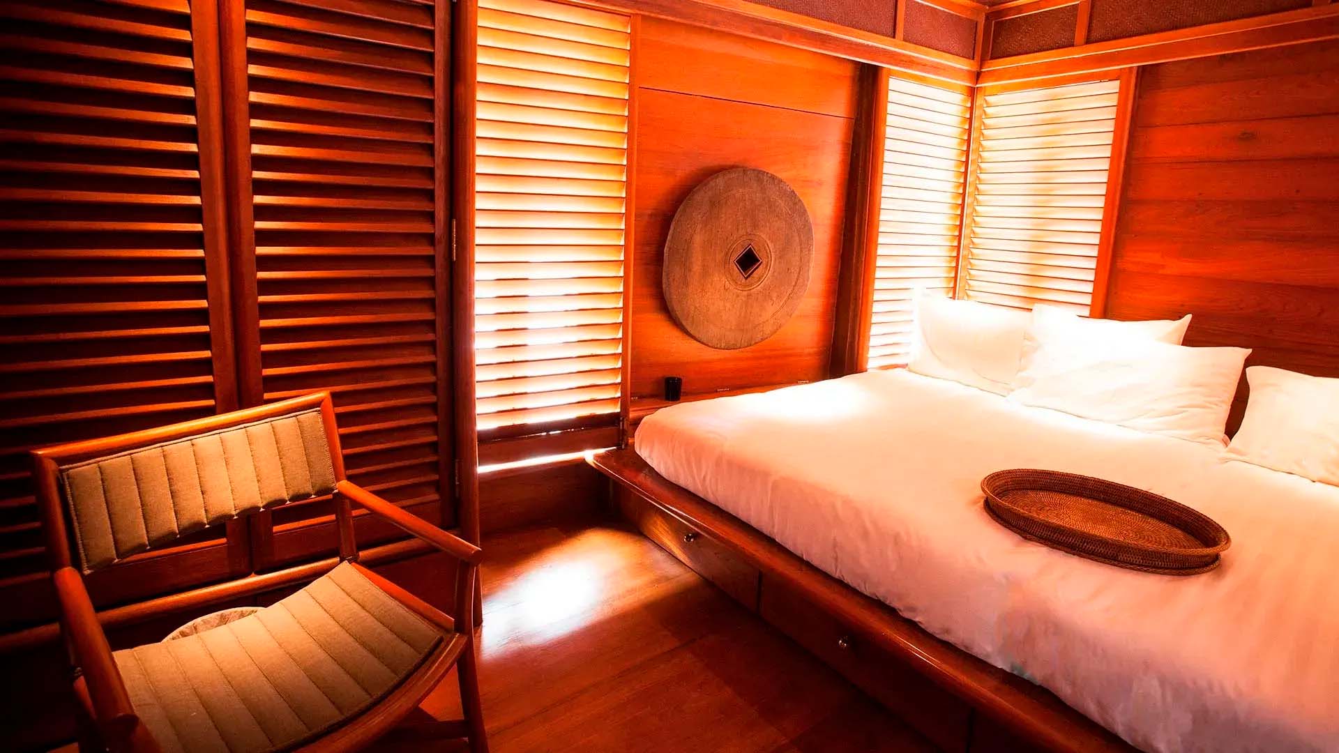 Под палубой вас ждут три палациальные каюты, каждая площадью 20 квадратных метров, размер, немыслимый для яхт такого класса. Кровати 140x200 см с бельём из египетского хлопка, индивидуальные гардеробные из тикового дерева, полностью раздельные ванные комнаты с душевыми кабинами и отдельными туалетами. На полу ковры Iger с традиционными узорами, на стенах текстиль Jim Thompson, созданный эксклюзивно для Maha Bhetra. Каждая каюта имеет собственный характер, но все объединяет одно: ощущение, что вы попали не на яхту, а в люкс Амана, только качающийся на волнах.