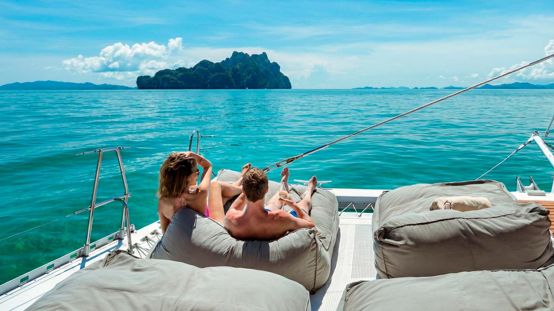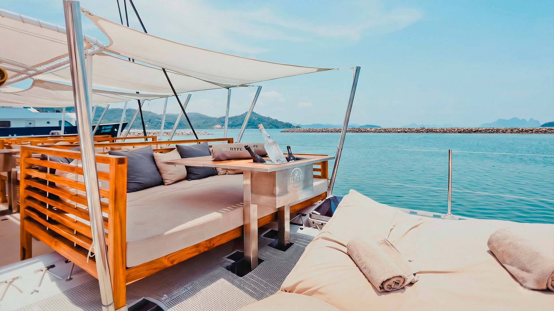 Носовая часть катамарана оборудована большими подушками и зоной для тех, кто хочет отдохнуть от шумной вечеринки. Здесь можно позагорать днем или уединиться для спокойного разговора вечером, пока основная часть компании танцует в центре.