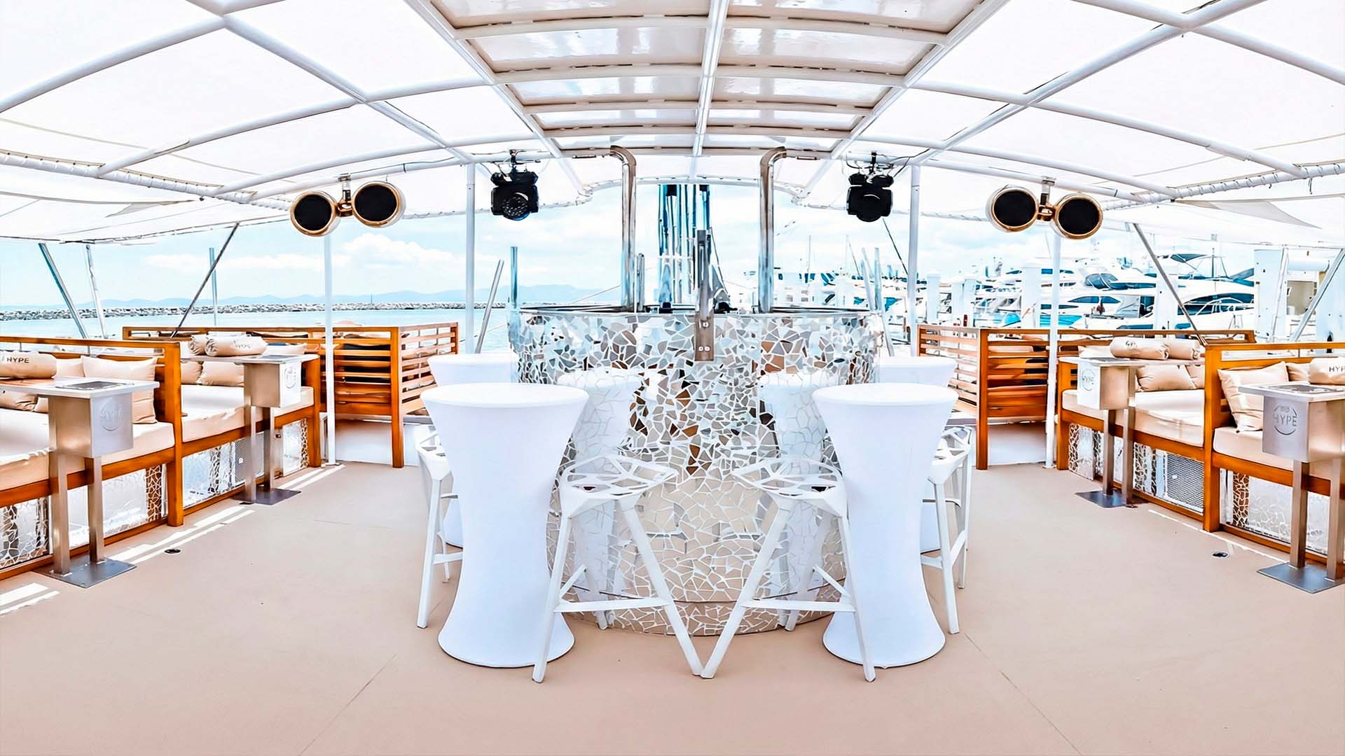 Сердце Party Catamaran - это центральная открытая зона площадью около 80 квадратных метров, здесь нет никакой мебели, никаких препятствий, только ровная поверхность, созданная для танцев. Когда музыка набирает обороты, а солнце садится за горизонт, эта зона превращается в танцпол, где одновременно могут двигаться 40-50 человек.