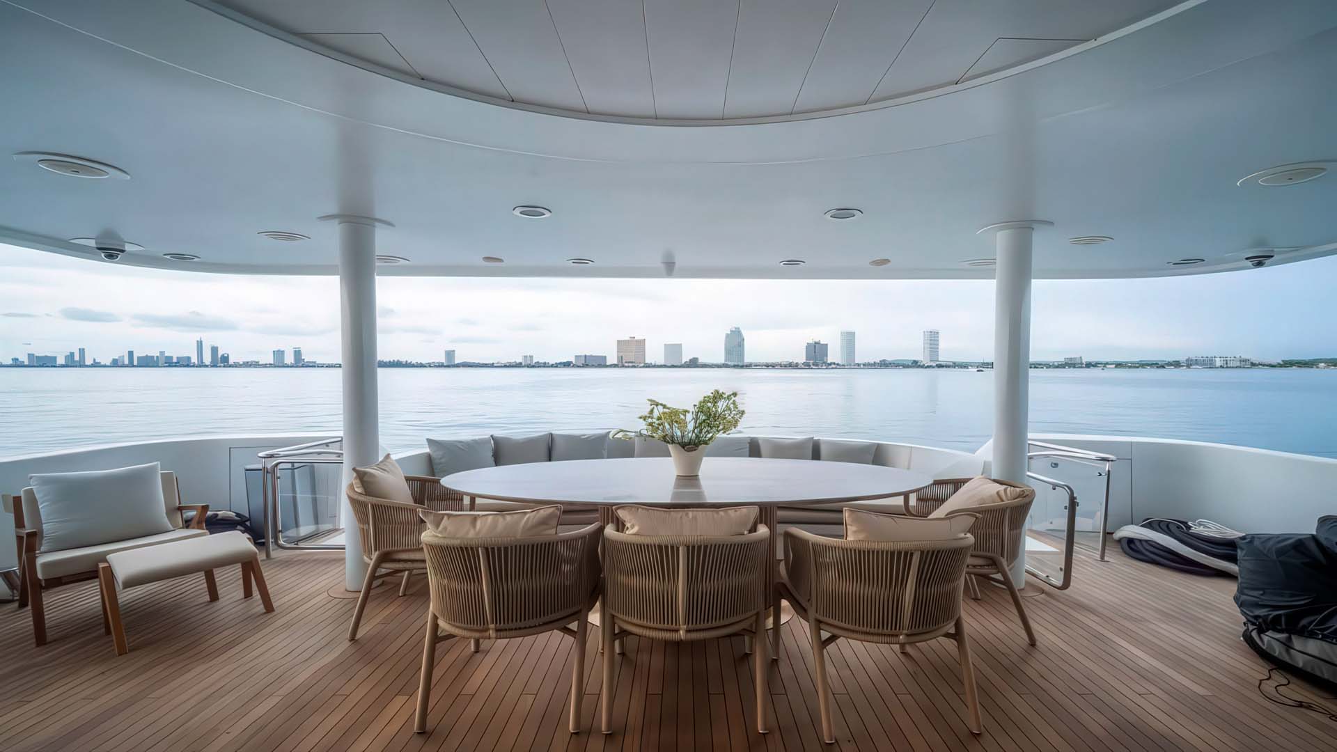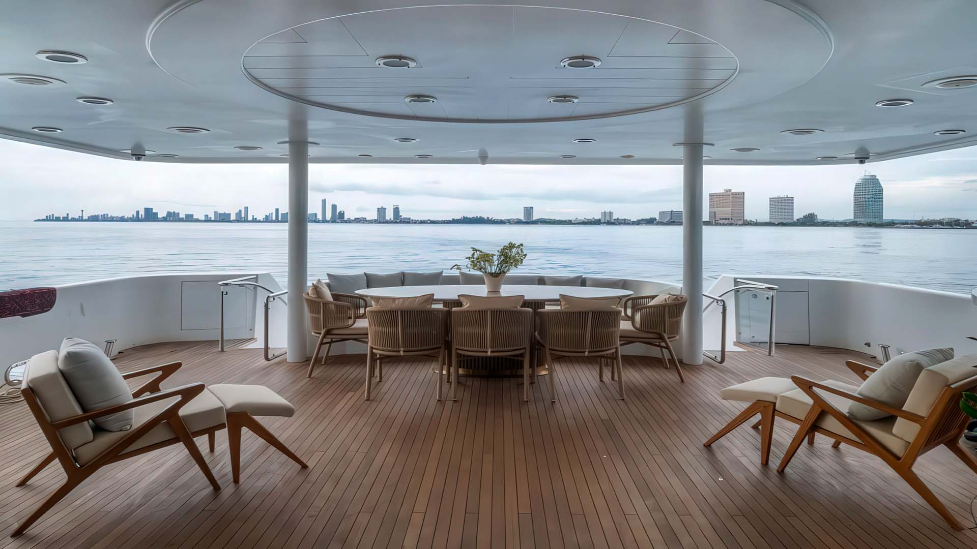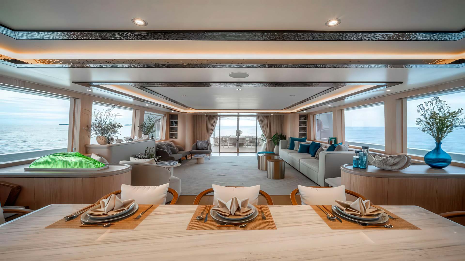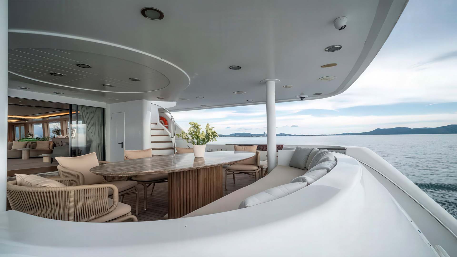 Это центр социальной жизни мега яхты. После рефита 2025, эта зона получила обновленную мебель и тайские декоративные акценты, создавая уникальную атмосферу. Открытая обеденная зона на корме вмещает стол на 10 персон под элегантным хардтопом, защищающим от солнца и р едких тропических дождей. Здесь сервируются завтраки с видом на острова и обеды во время якорных стоянок. Кормовая терраса главной палубы с прямым к платформе для плавания - это место, откуда начинаются все водные приключения. Здесь же расположен открытый лаунж для перекуса на свежем воздухе с видом на андаманское море.