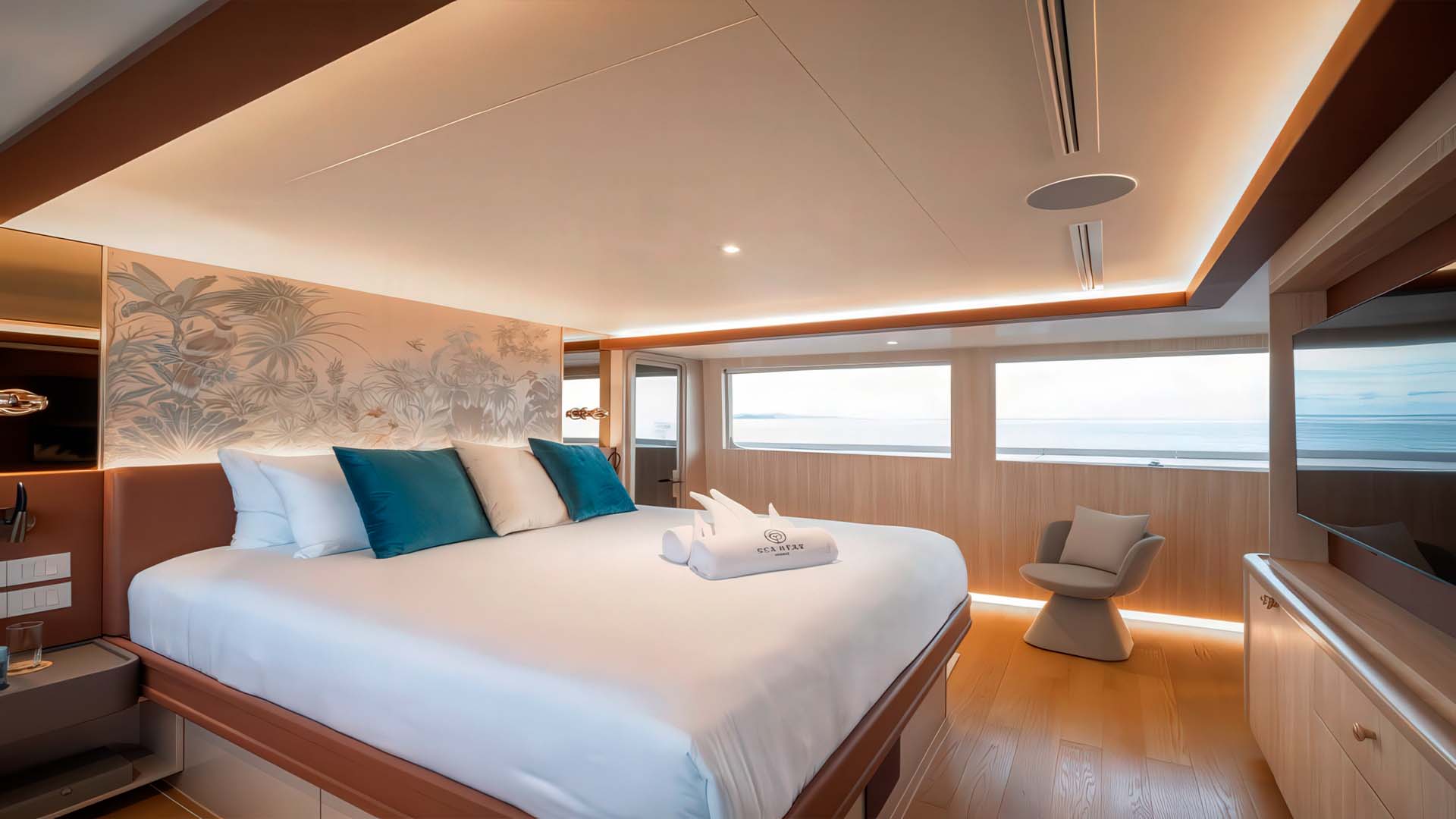 Входя в главный салон Sea Bear после, вы погружаетесь в уникальную атмосферу. Это не копирование тайского стиля, это тонкая интеграция: тайские текстуры в обивке, декоративные элементы ручной работы от местных мастеров, теплые тона тикового дерева в сочетании с современными материалами. Результат - пространство, которое ощущается премиально роскошно и, но при этом уникально переплетено с Таиландом. Обновленные интерьеры создают ощущение бутикового отеля, где мягкие ткани, современное освещение и работают в гармонии. После обновления каждая поверхность, каждая деталь говорит о внимании к качеству, но без показной роскоши - скорее, утонченная элегантность.