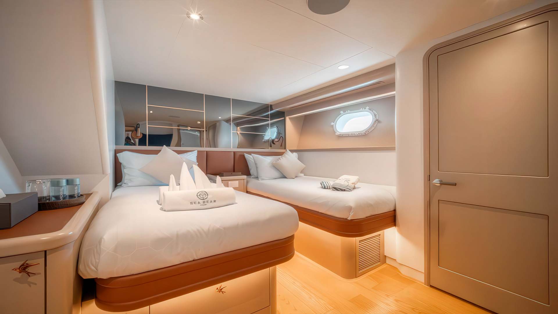 Две каюты с односпальными кроватями идеально подходят для детей или друзей. Они получили тот же уровень с вниманием к деталям, качественные матрасы, индивидуальные лампы для чтения, достаточно места для хранения, и собственные ванные комнаты.