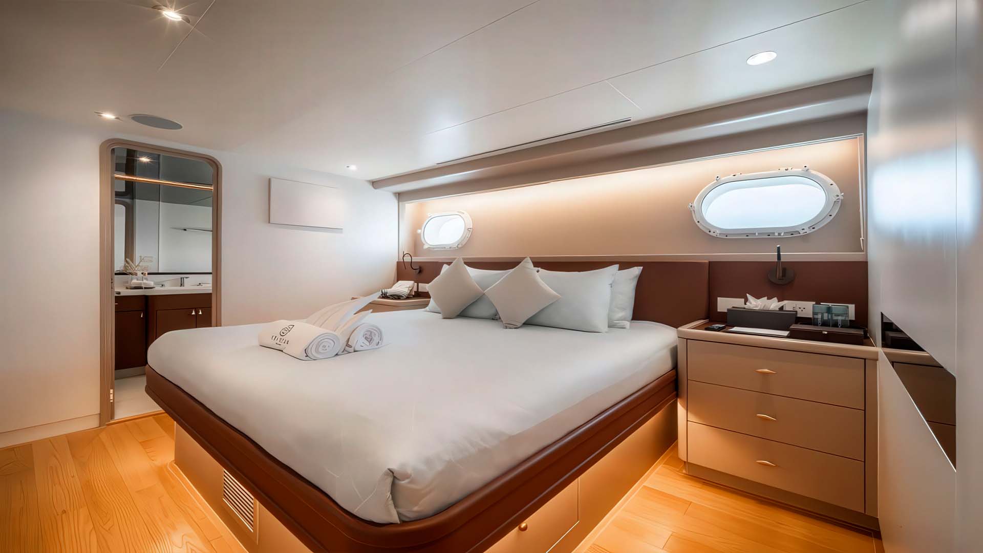 Одна из ключевых особенностей Westport 130 - это продвинутая система стабилизации качки, установленная для максимального комфорта гостей. Это означает, что ваши 10 гостей могут спокойно обедать, наслаждаться в джакузи на солнечной палубе или отдыхать в каютах без неприятного ощущения раскачивания. Для тех, кто подвержен морской болезни, это приятный бонус - на Sea Bear даже в открытой воде на пути к Phi Phi или Similan Islands, движение настолько планое, что легко забыть, что вы на яхте.
