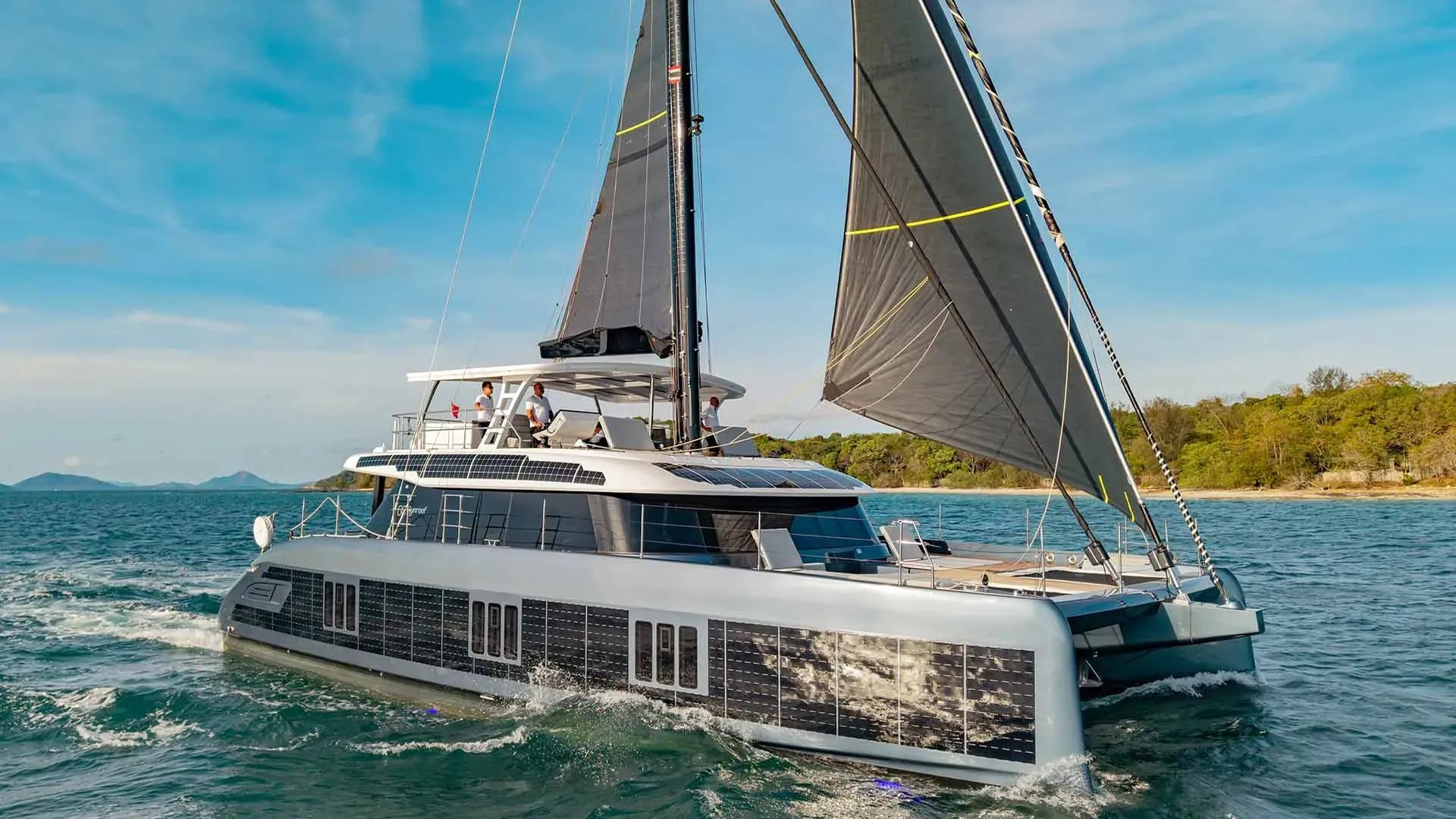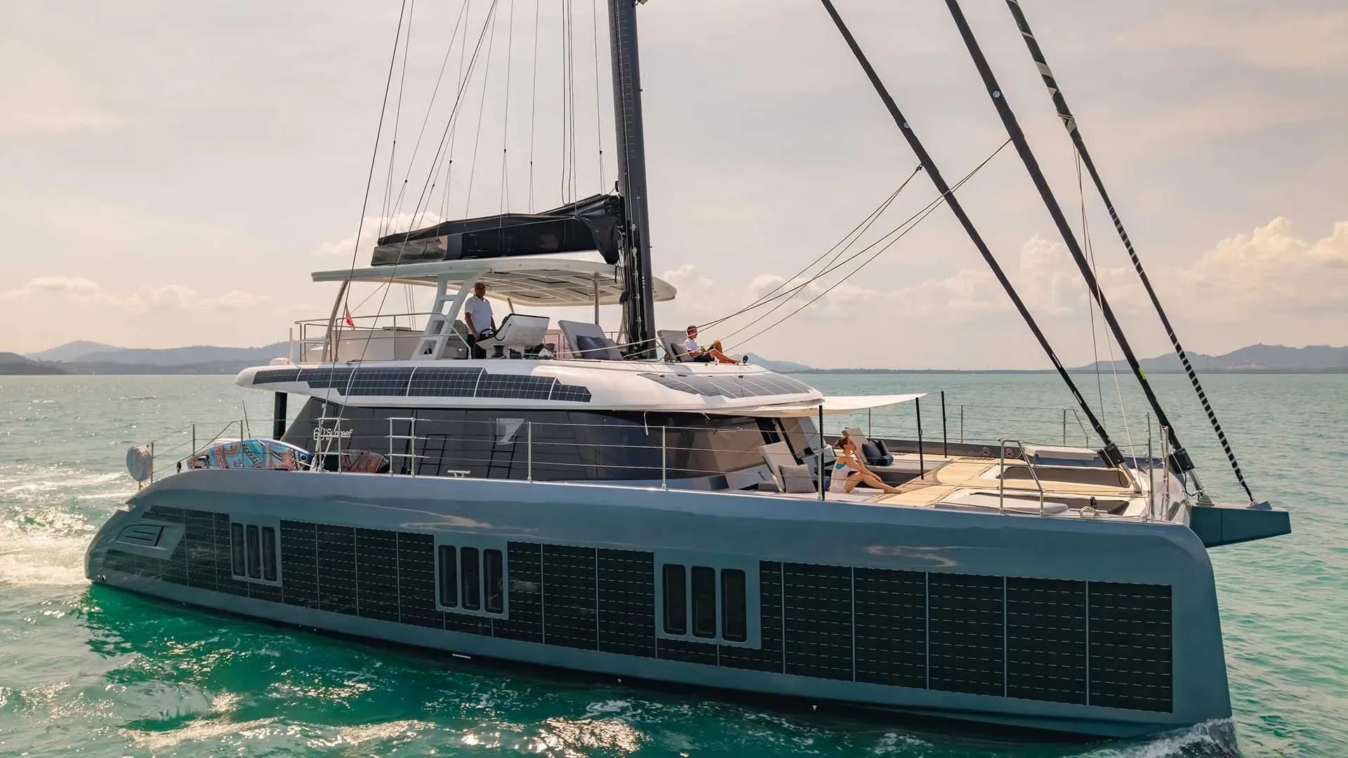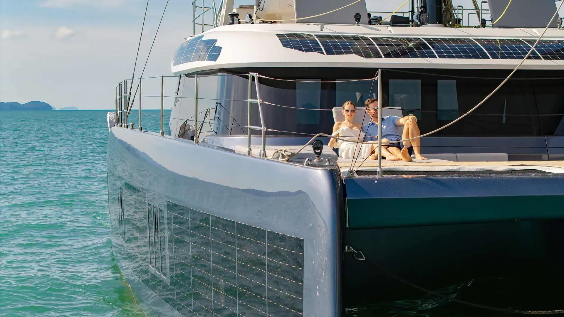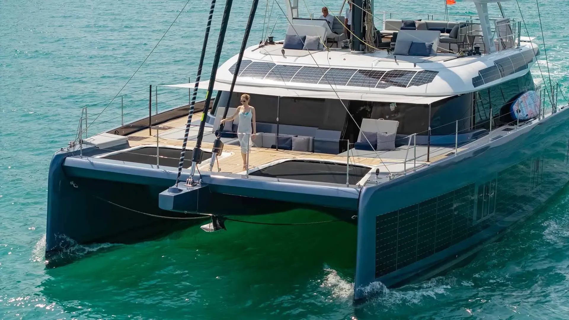 E-Motion построен в 2024 году и воплощает технологии, которые большинство яхт увидит лишь через десятилетие. 18.4-метровый катамаран оснащён собственной революционной системой Solar Skin 3.0 - ультратонкими солнечными панелями толщиной менее миллиметра, интегрированными прямо в корпус, надстройку и бимини. Эти панели не просто декор: они генерируют до 17 кВт энергии, питая всё: от кондиционеров до электродвигателей. Мощные литиевые батареи ёмкостью 140-200 кВт позволяют судну работать автономно более 24 часов без единого генератора.