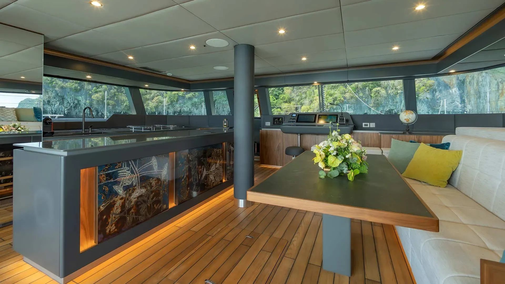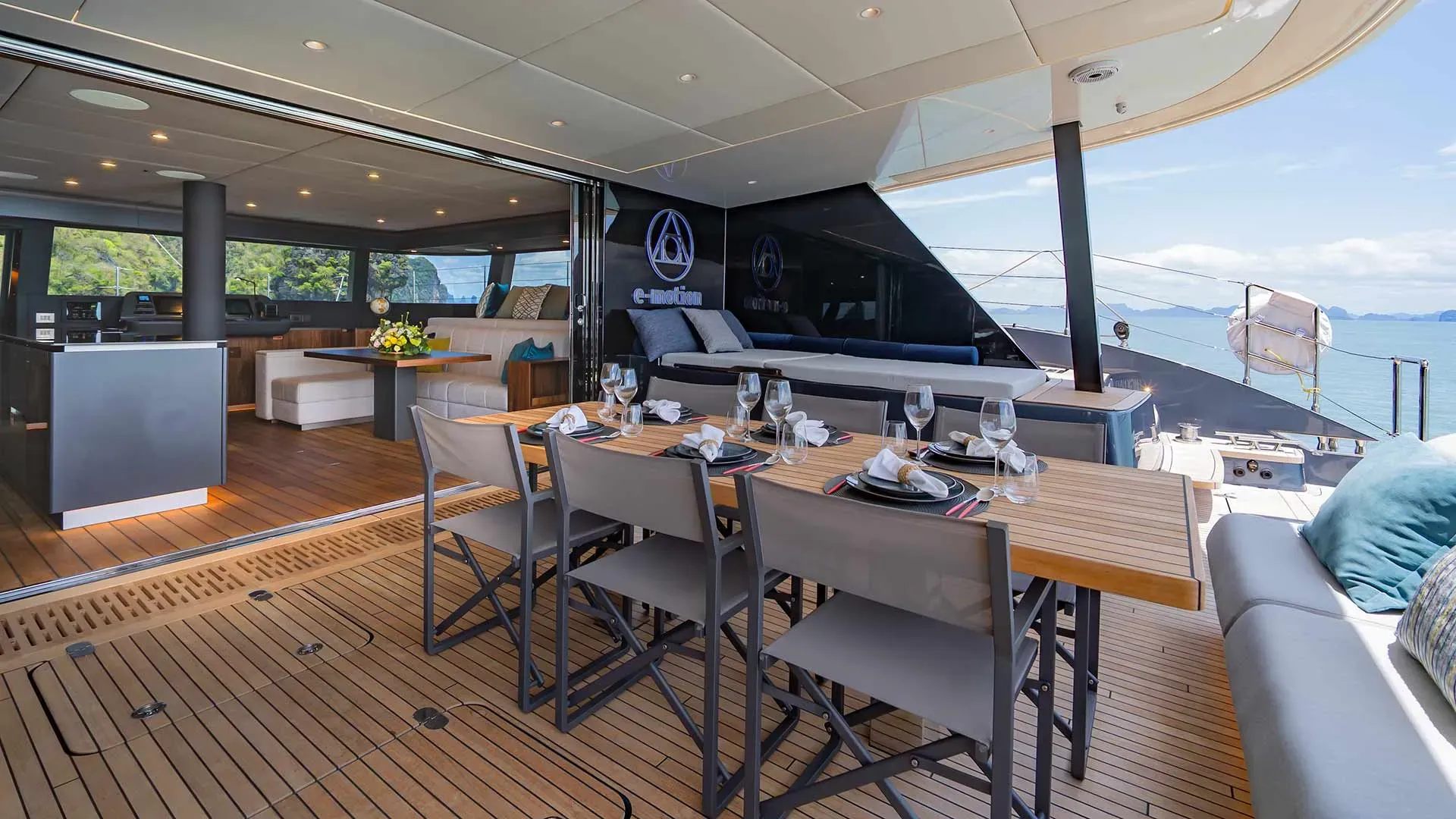 Зайдите на борт E-Motion, и первое, что вас поразит, это ощущение невесомости и простора. 10.2-метровая ширина катамарана создаёт объёмы, невозможные на моно-яхтах. Панорамный салон с огромными окнами, превращает границу между интерьером и экстерьером в иллюзию. Вы не в закрытом помещении, вы парите над водой в стеклянном пузыре, наблюдая за игрой солнца на волнах.