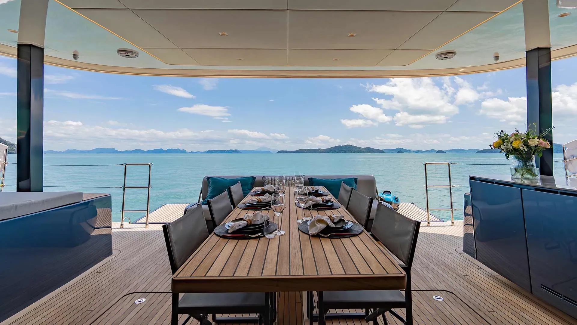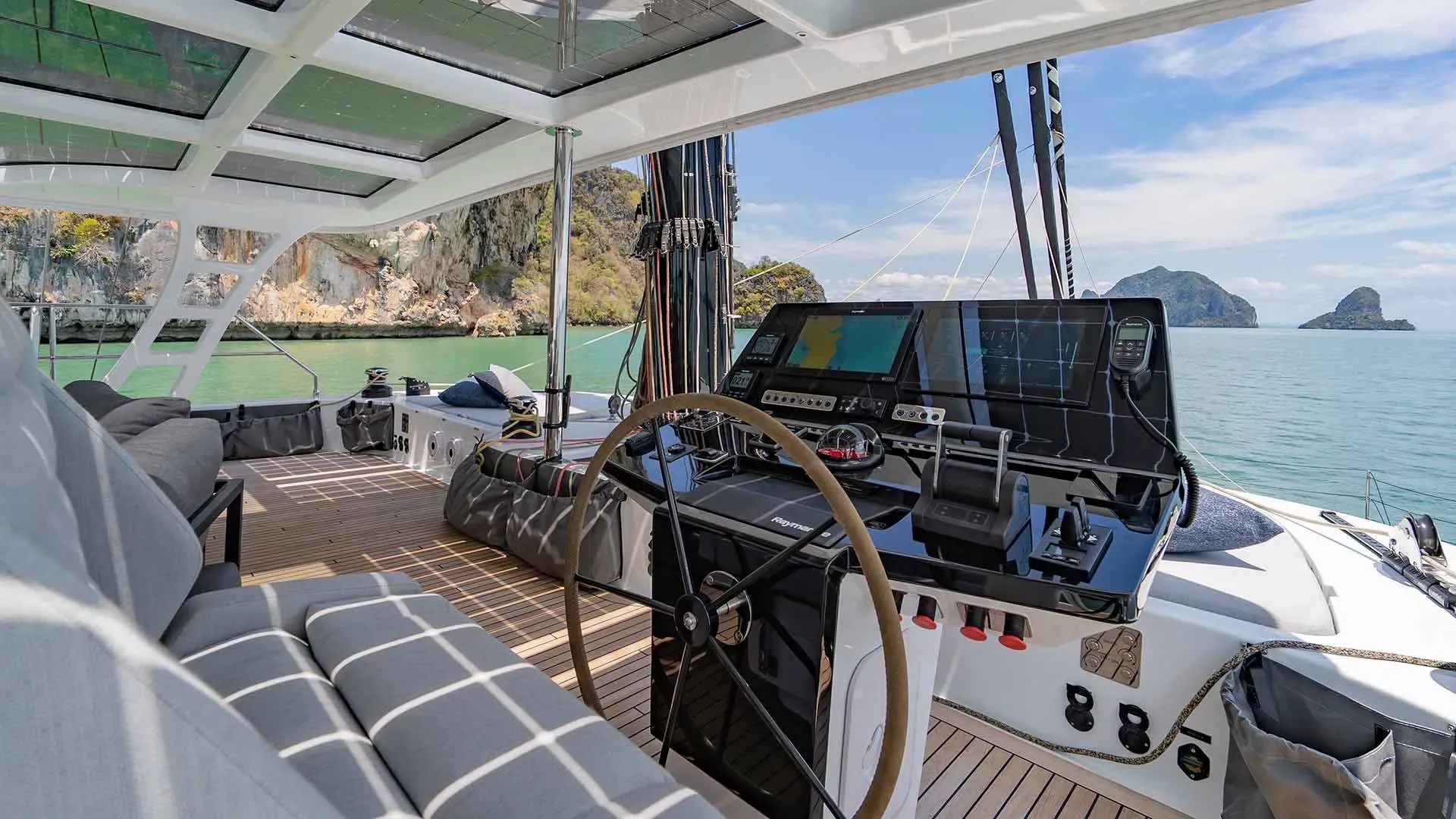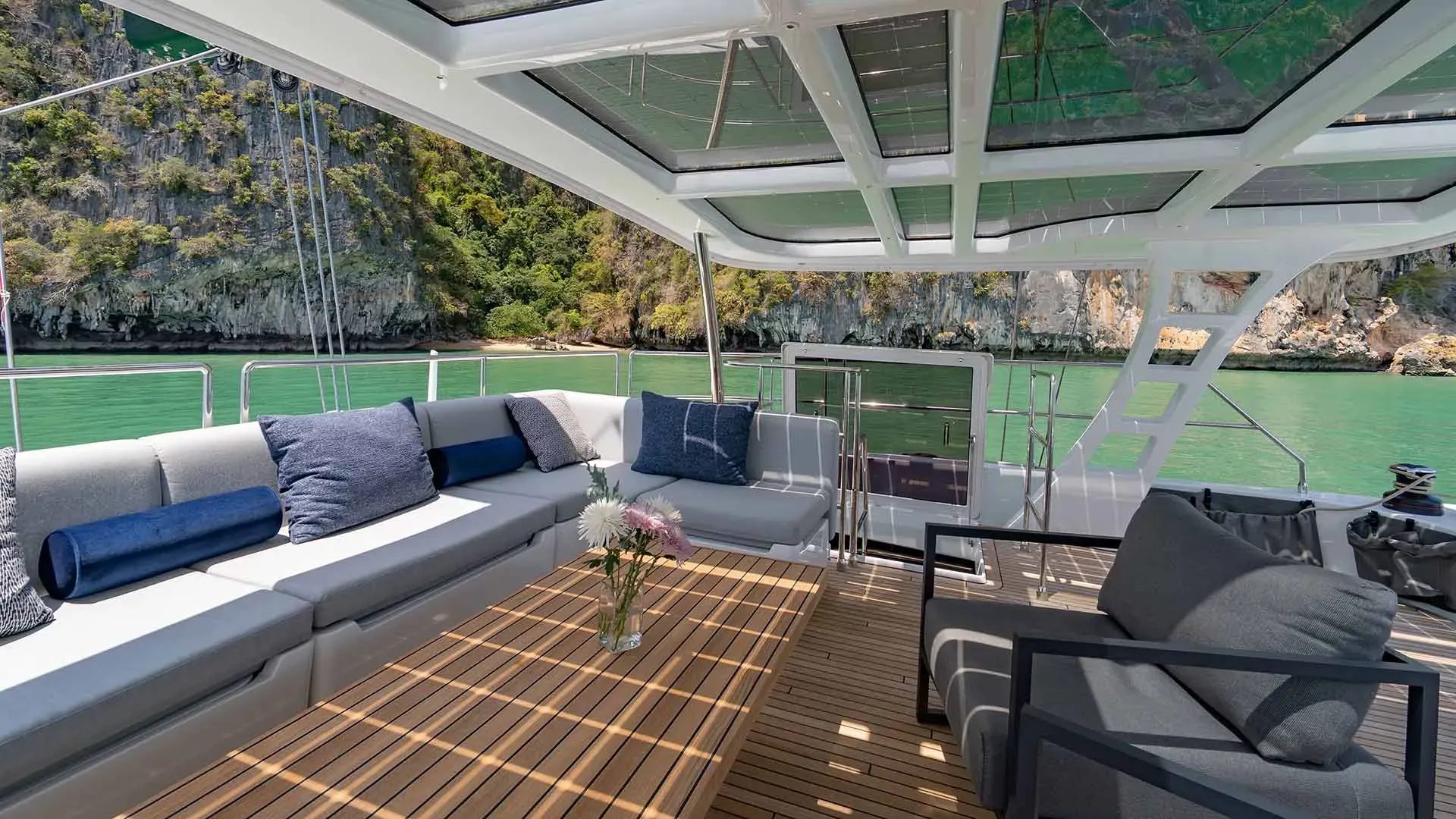 Флайбридж E-Motion - это отдельная вселенная на высоте. Здесь вас ждёт панорама на 360 градусов: известняковые скалы Краби справа, закатное небо впереди, силуэт Пхукета сзади. Мокрый бар, C-образный диван для всех ваших гостей, зона для загара, всё продумано так, чтобы каждая минута на воздухе становилась событием.