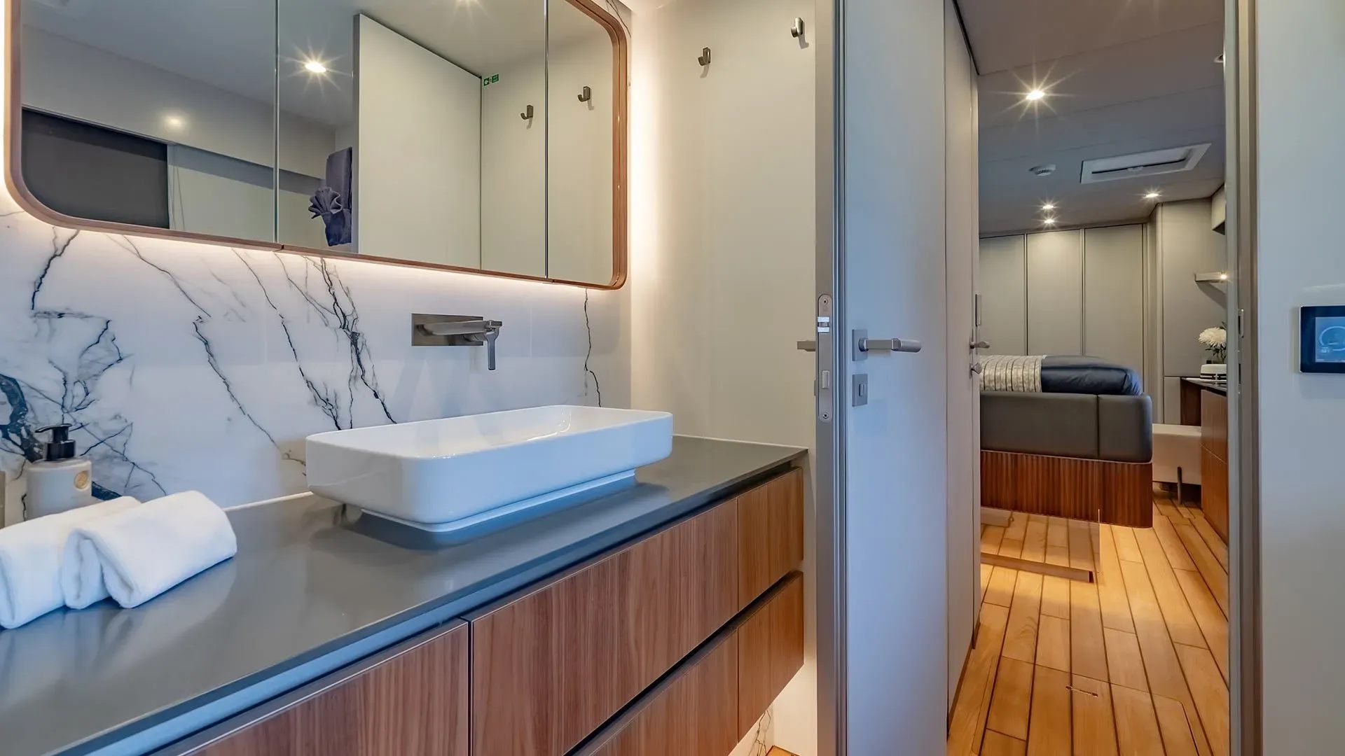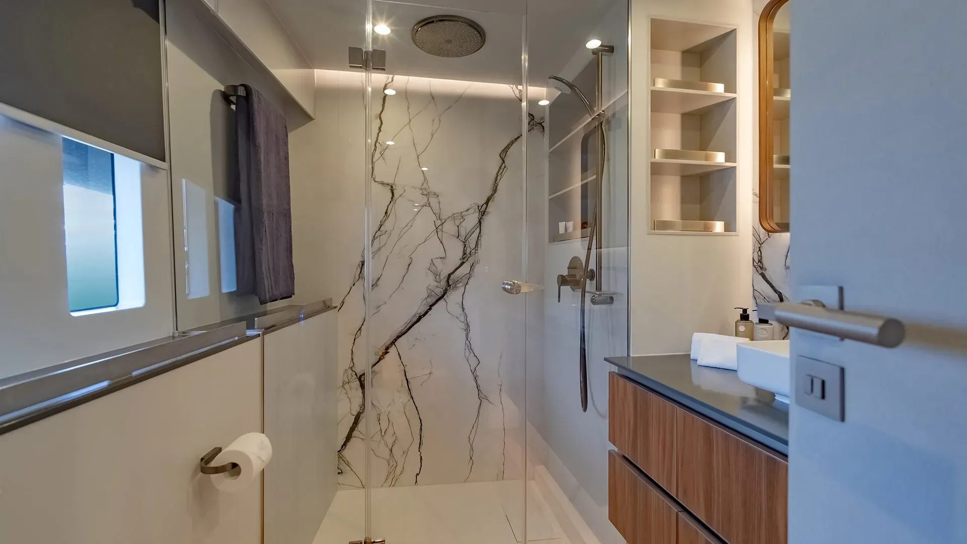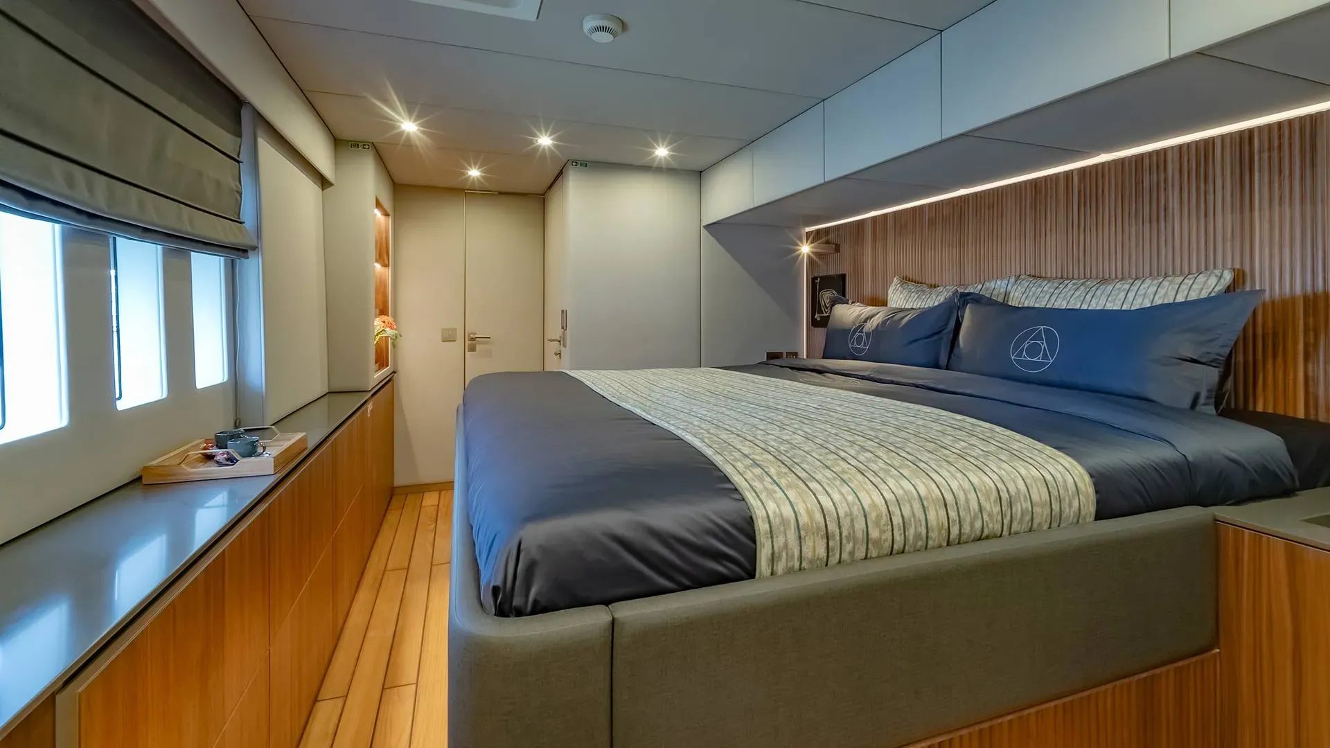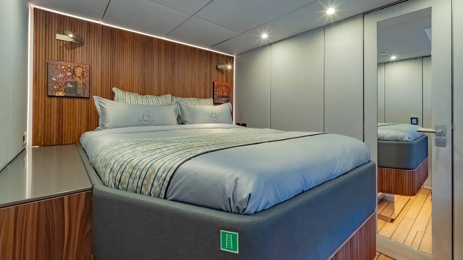 Четыре элегантные каюты разместят до восьми гостей в условиях, где эко-подход не означает компромисс. Полы из бирманского тикового дерева, мрамор Каррара в душевых, натуральный шпон и продуманное освещение создают атмосферу дзен-роскоши. Каждая каюта имеет собственную цветовую палитру, не для красоты, а для практичности: ваши полотенца и бокалы всегда узнаваемы, что создаёт ощущение личного пространства даже в компании друзей.