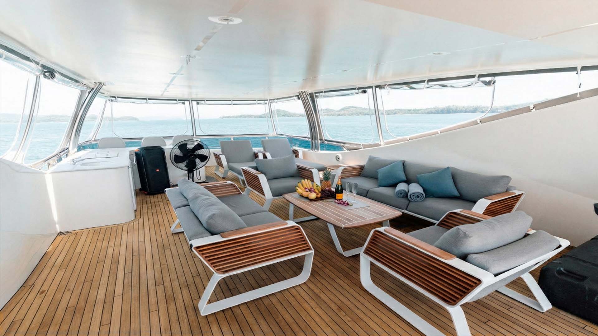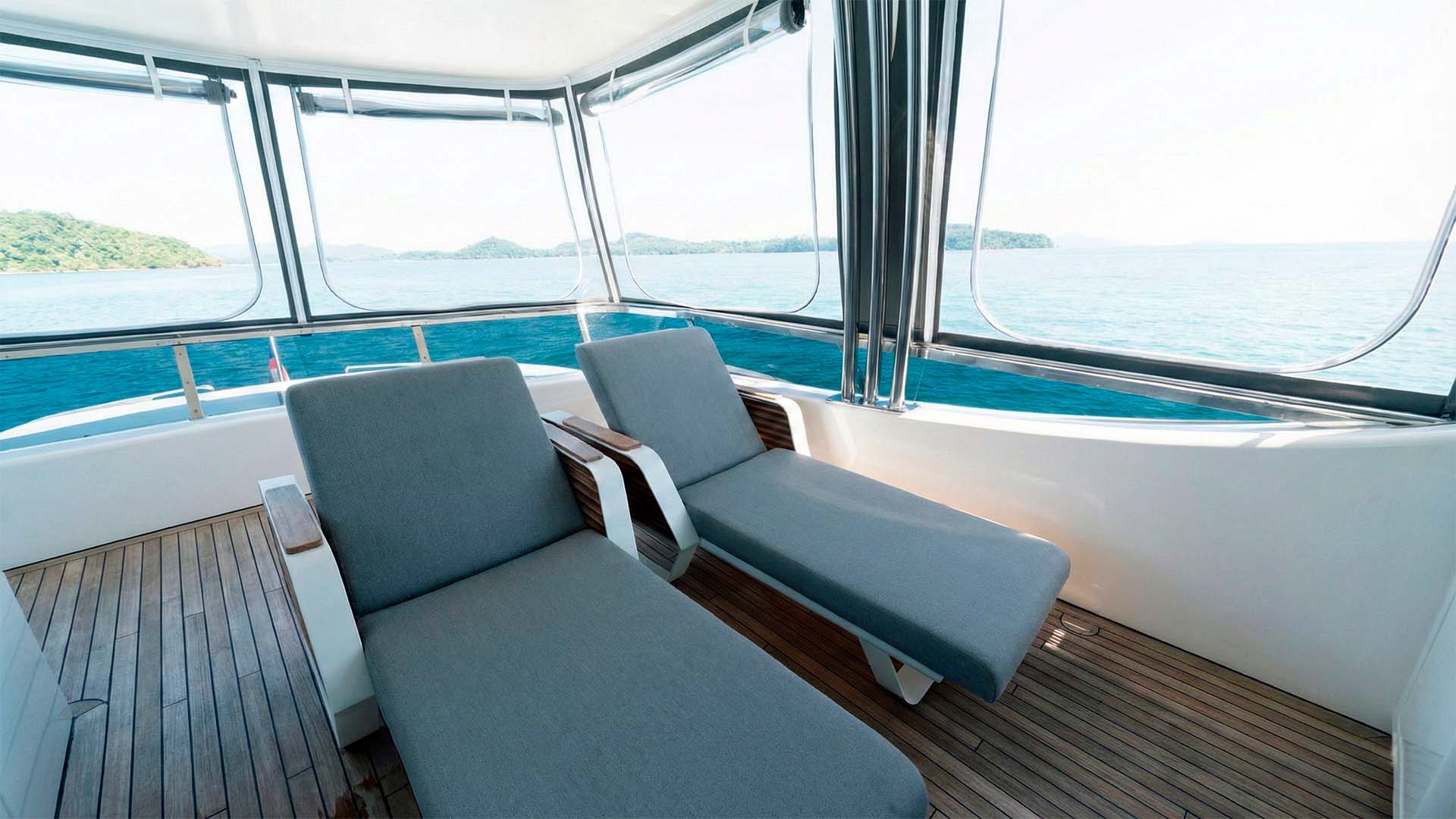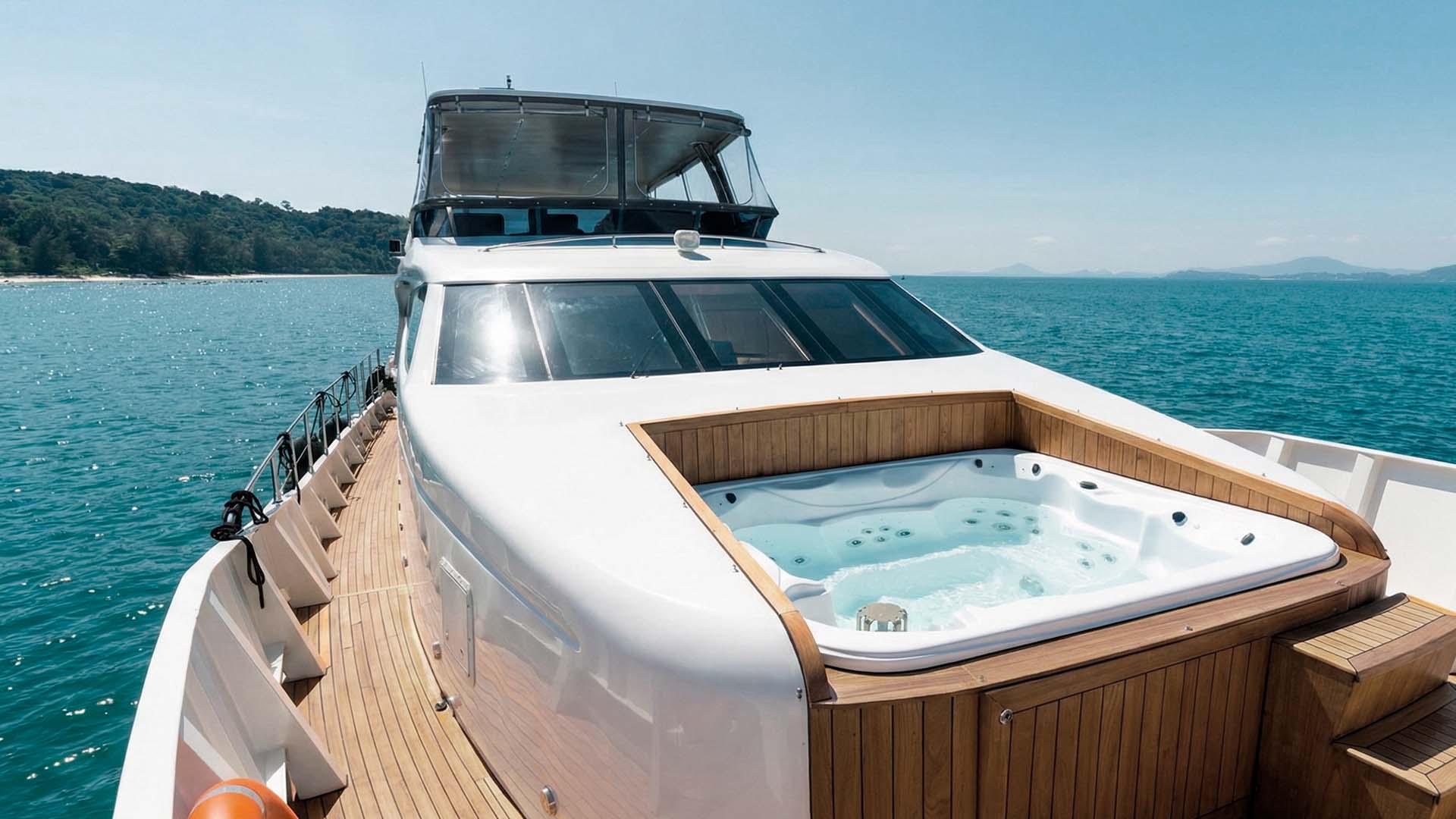 Особая гордость Sunseeker 34M, просторная гидромассажная ванна, расположенная на носовой палубе. Это идеальное место для полного расслабления: представьте себе, как вы погружаетесь в теплую воду с бокалом шампанского, любуясь изумрудными островами на горизонте. Пузырьки джакузи, морской бриз и панорамные виды на Андаманское море создают незабываемую атмосферу блаженства. Будь то рассвет, яркий полдень или романтический закат, джакузи на носу станет одним из любимых мест на яхте.