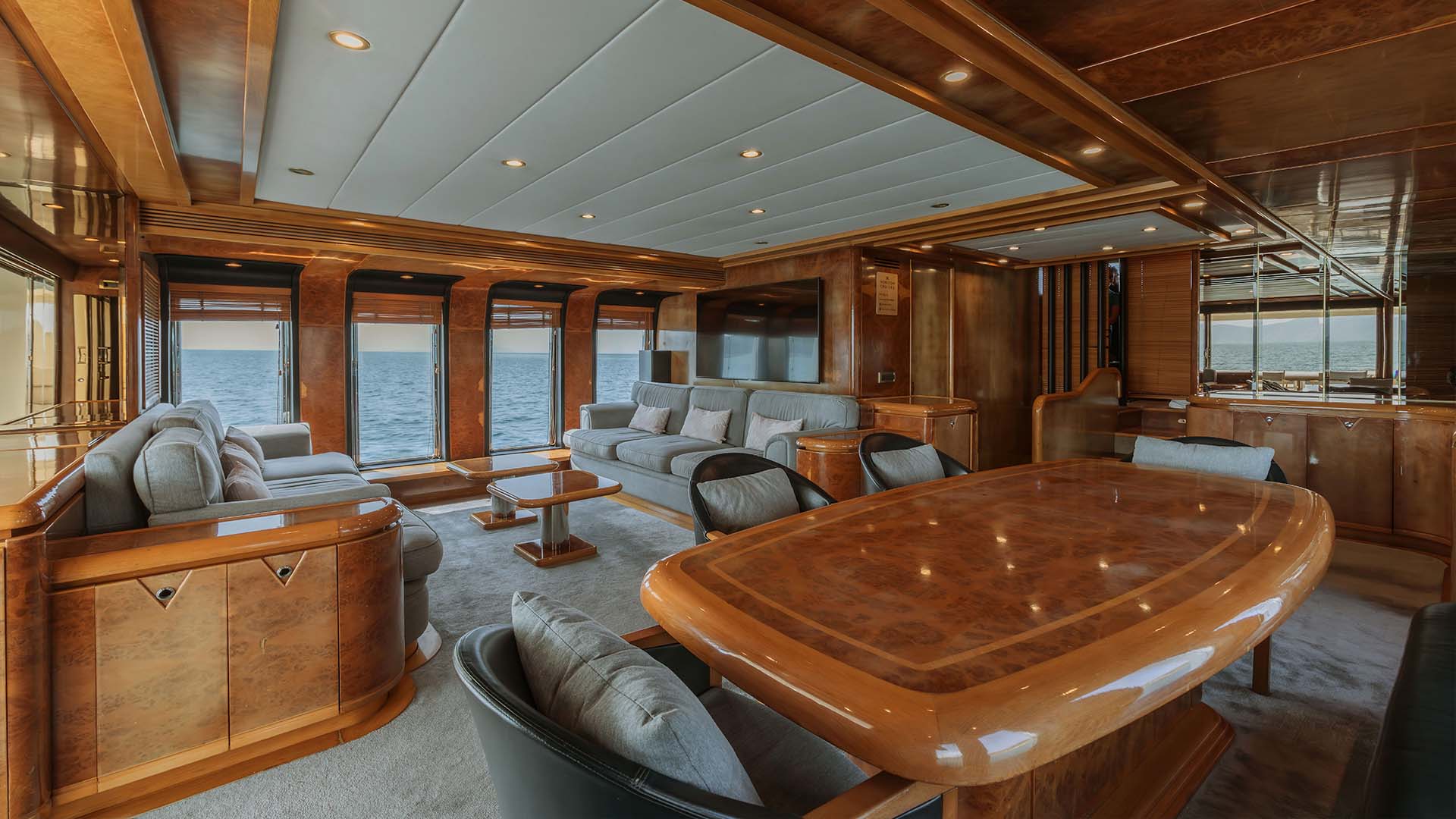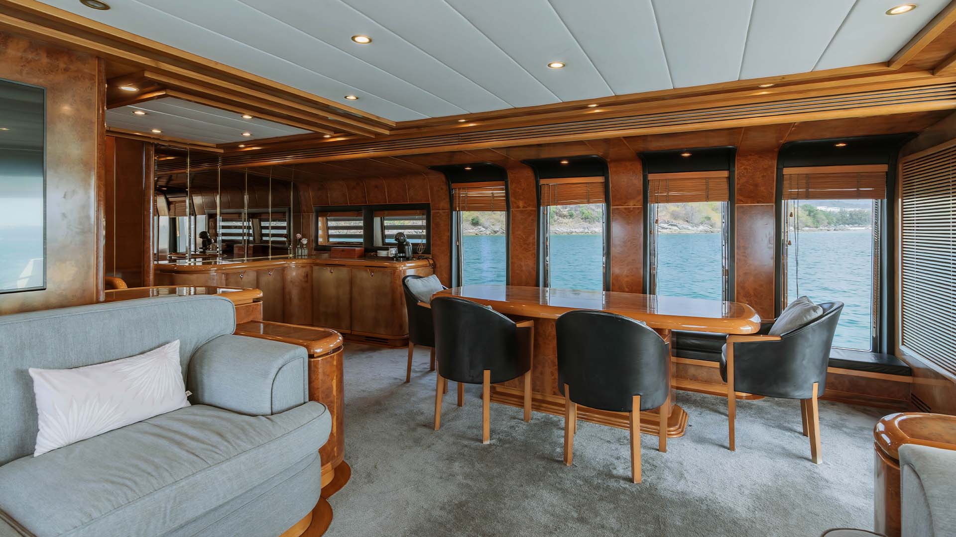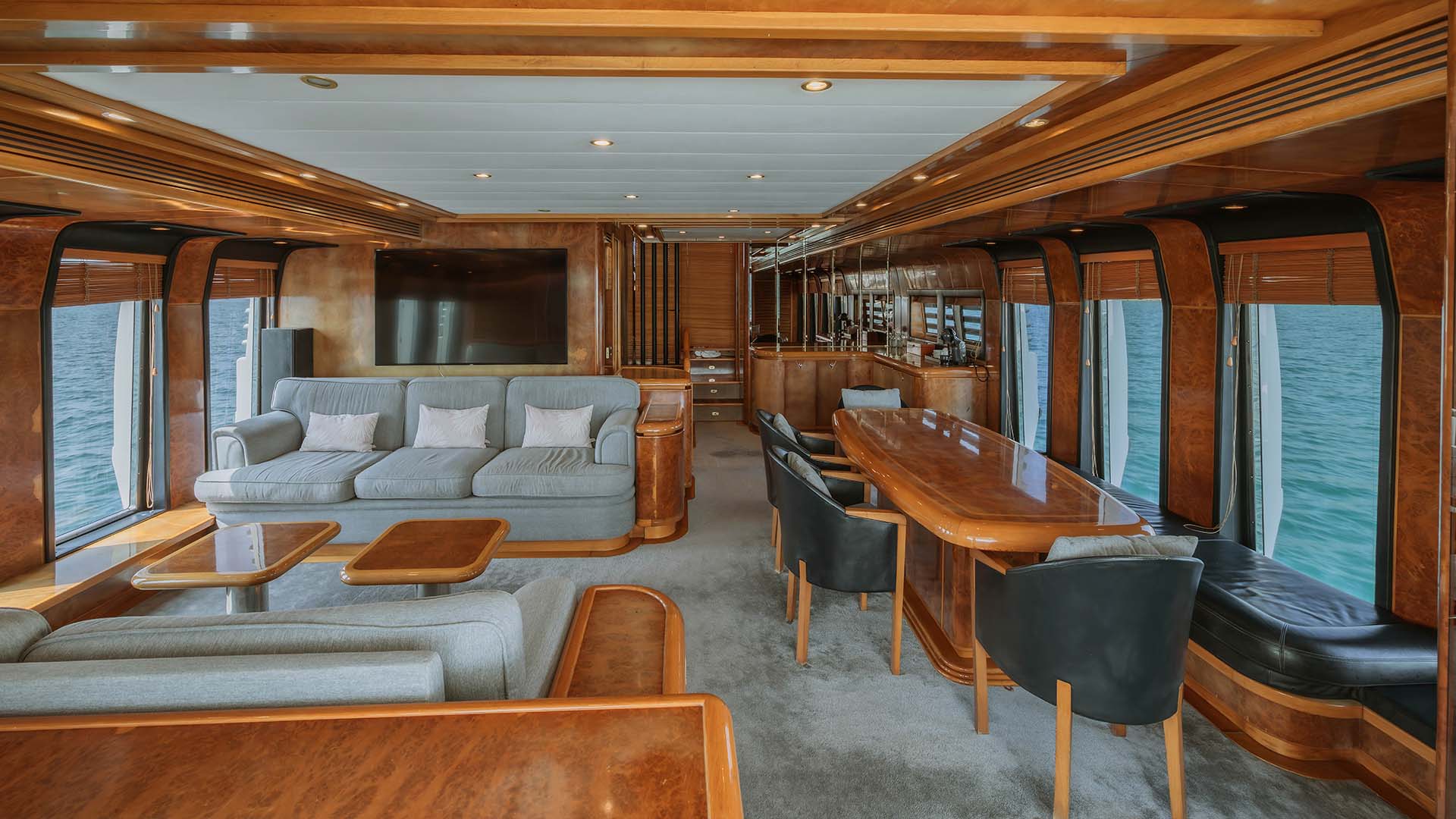 На борту яхты есть просторная гостиная зона, где гости могут отдыхать и наслаждаться красивым видом на море. Кроме того, на яхте есть кухня и бар, где гости могут заказать различные напитки и блюда.
