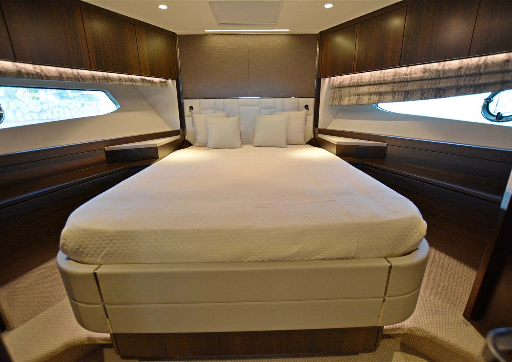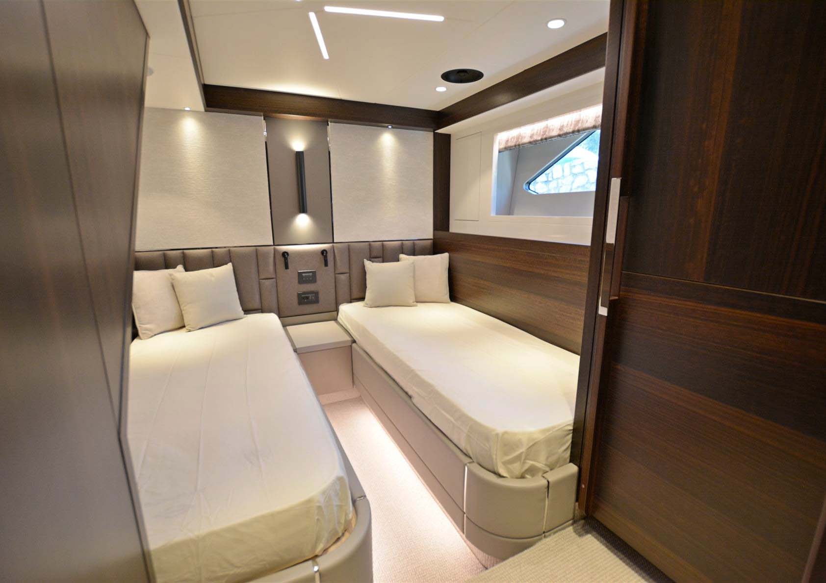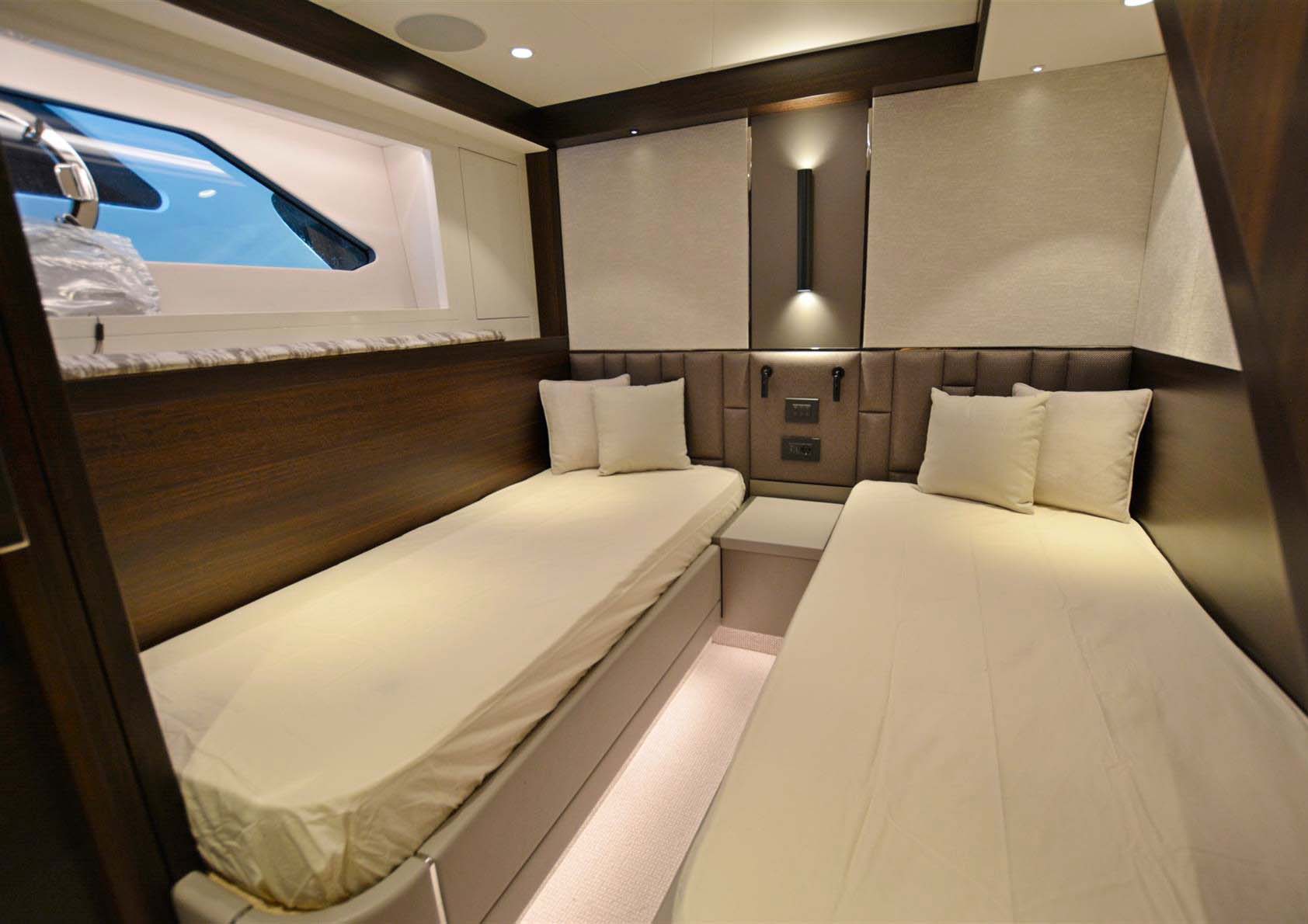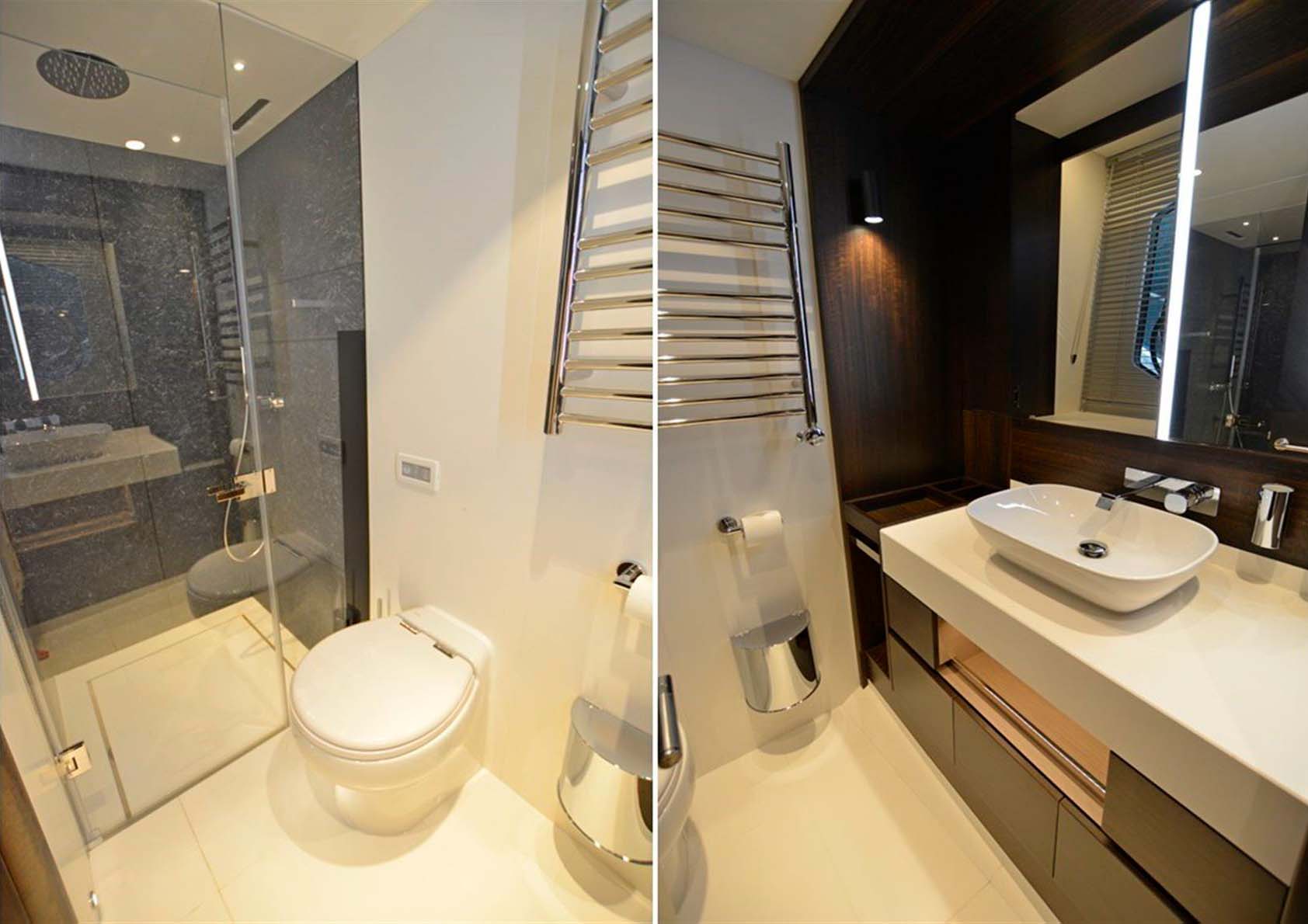 Великолепная гостиная раскрывается перед вами через раздвижные двери. Кухня, оборудованная по последнему слову техники, обеденная зона оформлена с изыском и украшена красивым столом из натурального дерева. В уютном лаунж-уголке вы найдете огромный диван с телевизионной тумбой и шезлонгом. На нижней палубе располагается роскошная мастер-каюта с отдельным входом. Еще 3 гостевые каюты: VIP-каюта расположена носу судна с отдельной ванной и 2 гостевые каюты находятся на правом и левом борту, рядом роскошная ванная комната для гостей. Для экипажа, на корме яхты, каюта на двух человек с отдельной ванной комнатой.